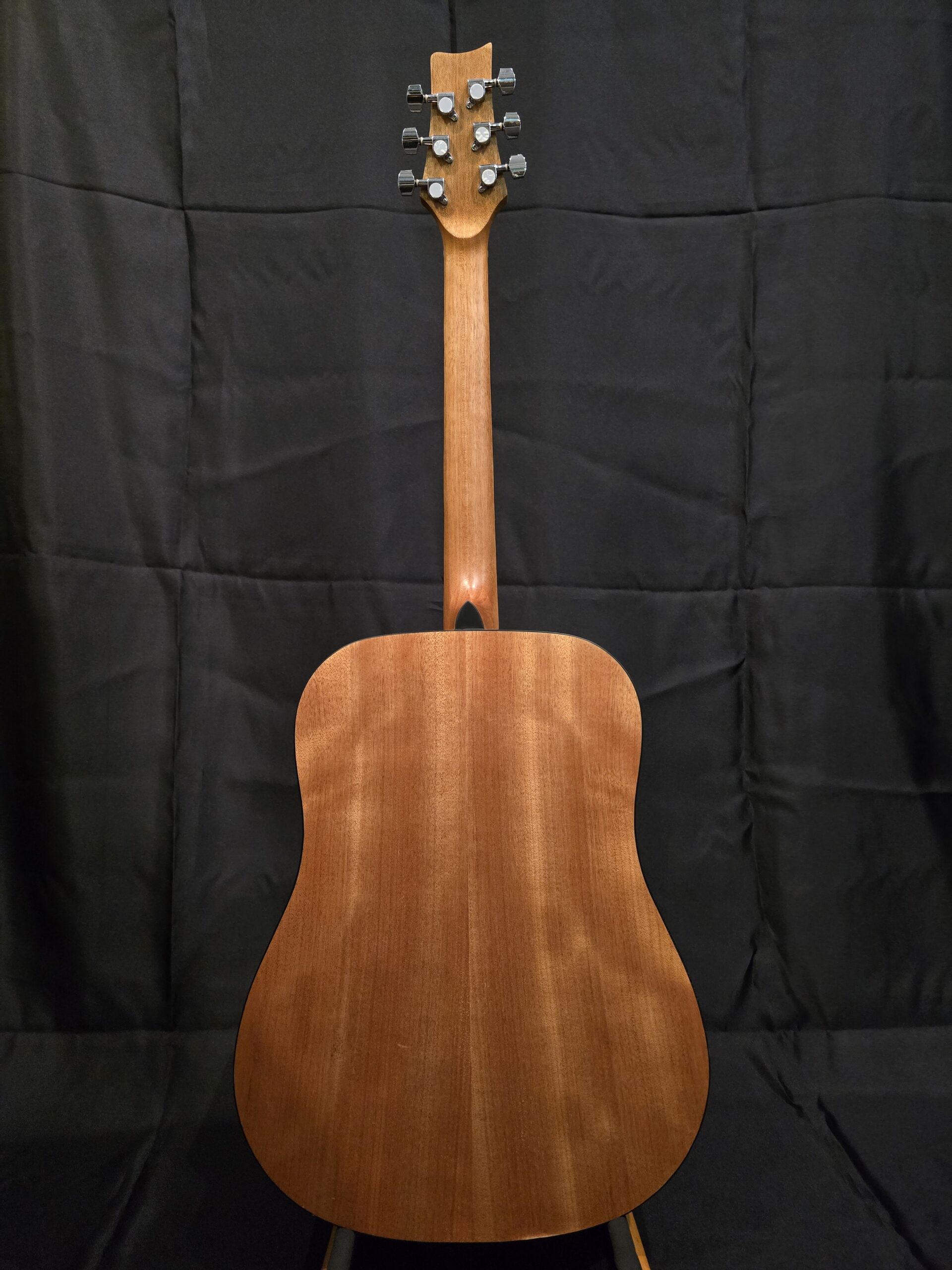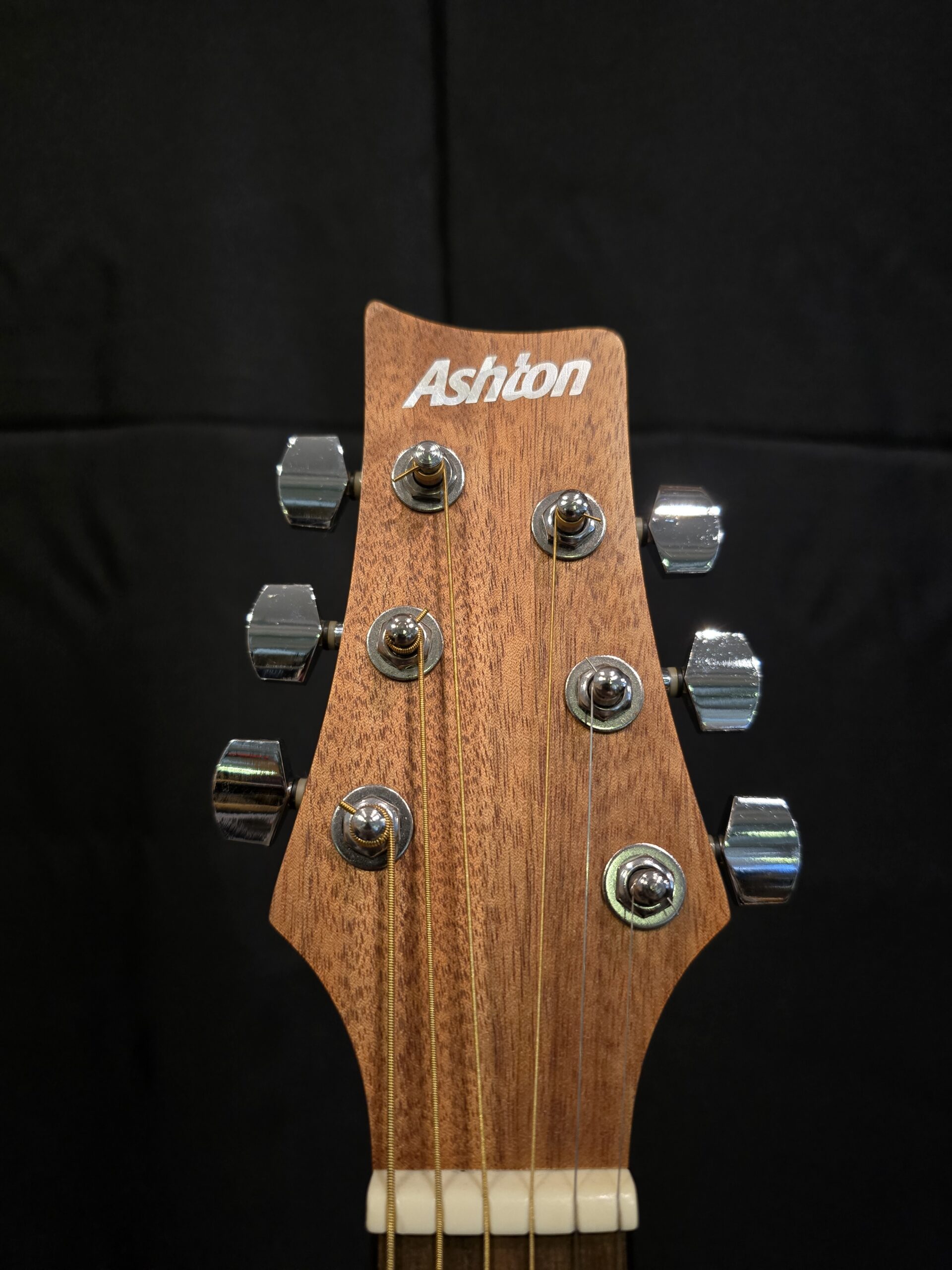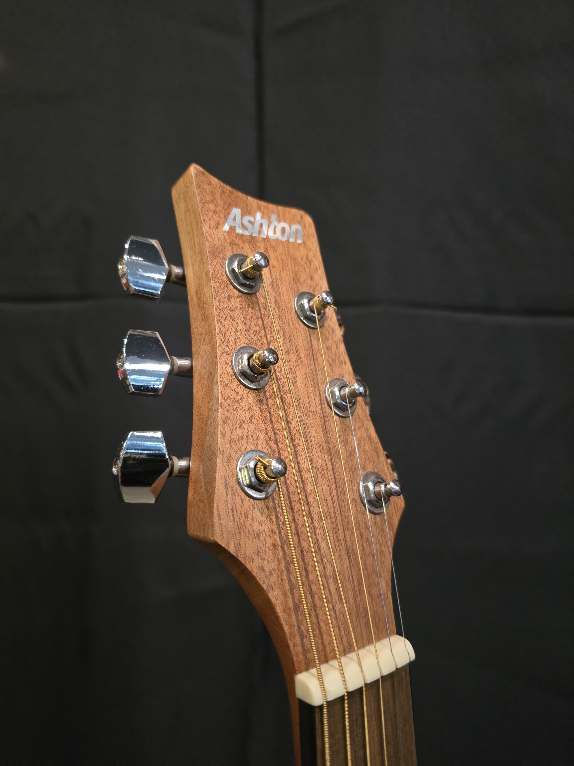 Het bovenblad van de Ashton D20 is vervaardigd uit massief sparrenhout, wat bekend staat om zijn resonantie en helderheid. Dit zorgt voor een levendig geluid met een goed gedefinieerde toon, waardoor zowel akkoorden als individuele noten goed tot hun recht komen. De body van de gitaar is gemaakt van basswood, wat bijdraagt aan het lage gewicht van het instrument en toch een warme klank biedt.