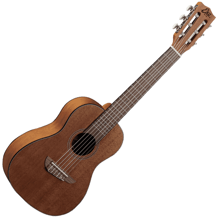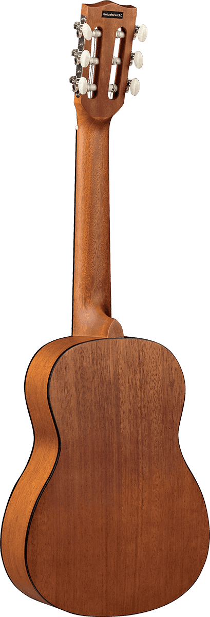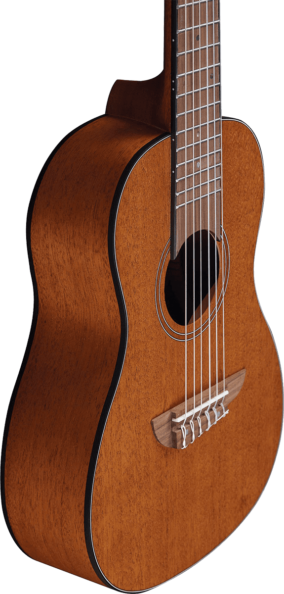 De 480 mm mensuur en 19 frets maken het instrument toegankelijk voor zowel kinderen als volwassen spelers. De hals van okoumé ligt prettig in de hand, terwijl de toets en brug van Zuid-Amerikaanse roupanà zorgen voor een natuurlijke feel en direct speelcomfort. De open mechanieken geven een klassieke uitstraling en maken stemmen eenvoudig.