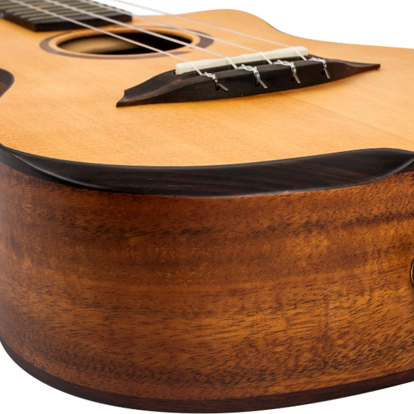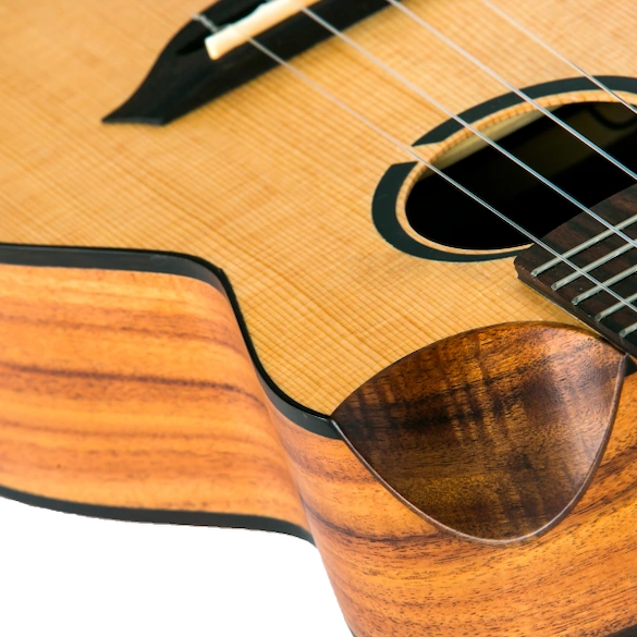 De Afrikaans mahonie hals en ebbenhouten toets zorgen voor stabiliteit, soepele bespeelbaarheid en een luxe uitstraling. Dankzij de compensated bone saddle is de intonatie nauwkeurig en blijft de klank in alle registers zuiver. De scalloped cutaway maakt moeiteloos spelen in de hoge posities mogelijk, terwijl de ebbenhouten armrest extra comfort biedt tijdens lange speelsessies.