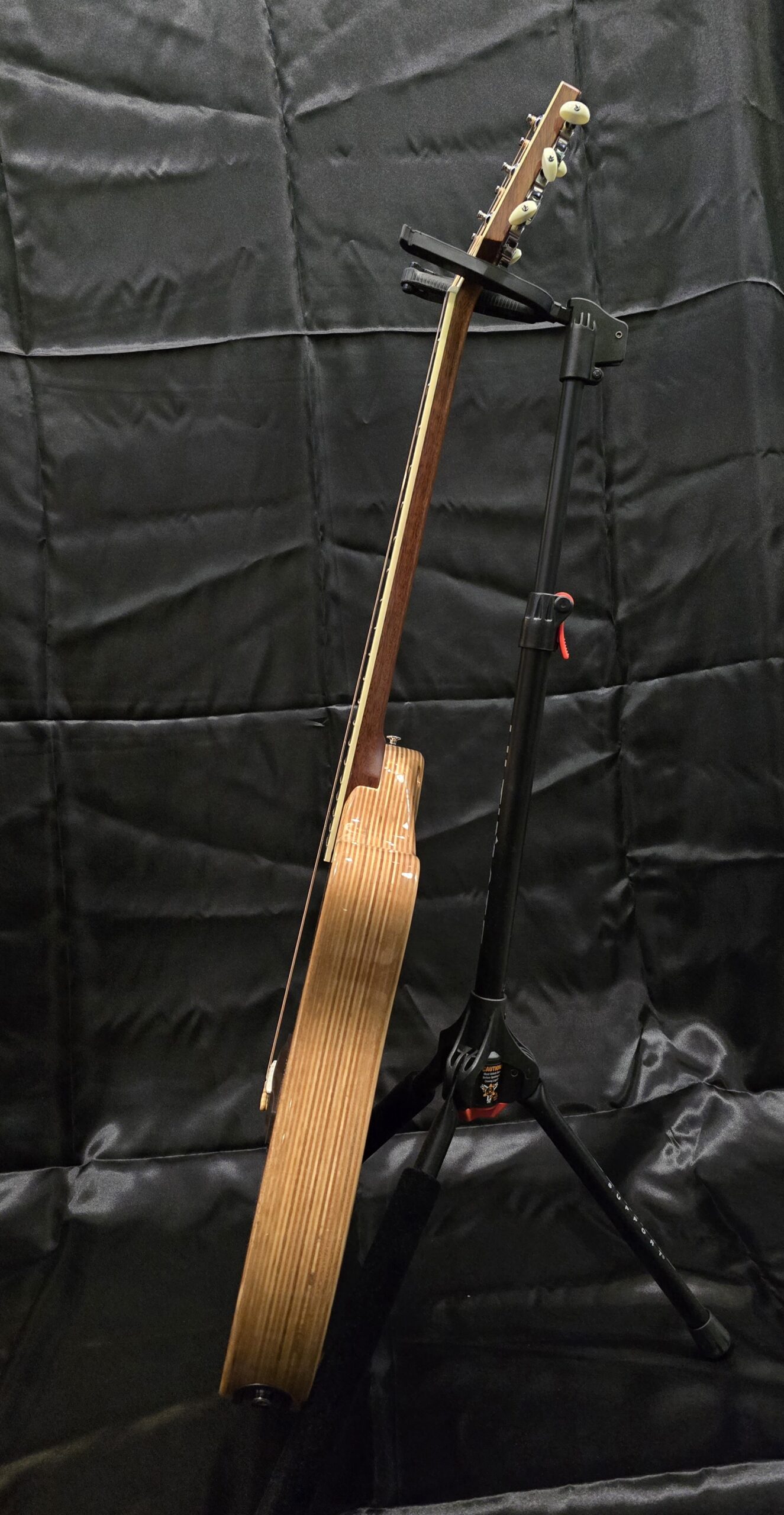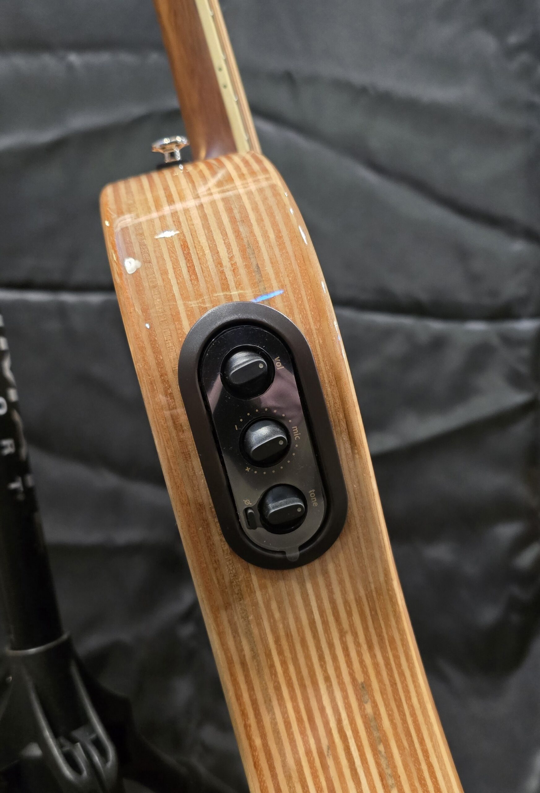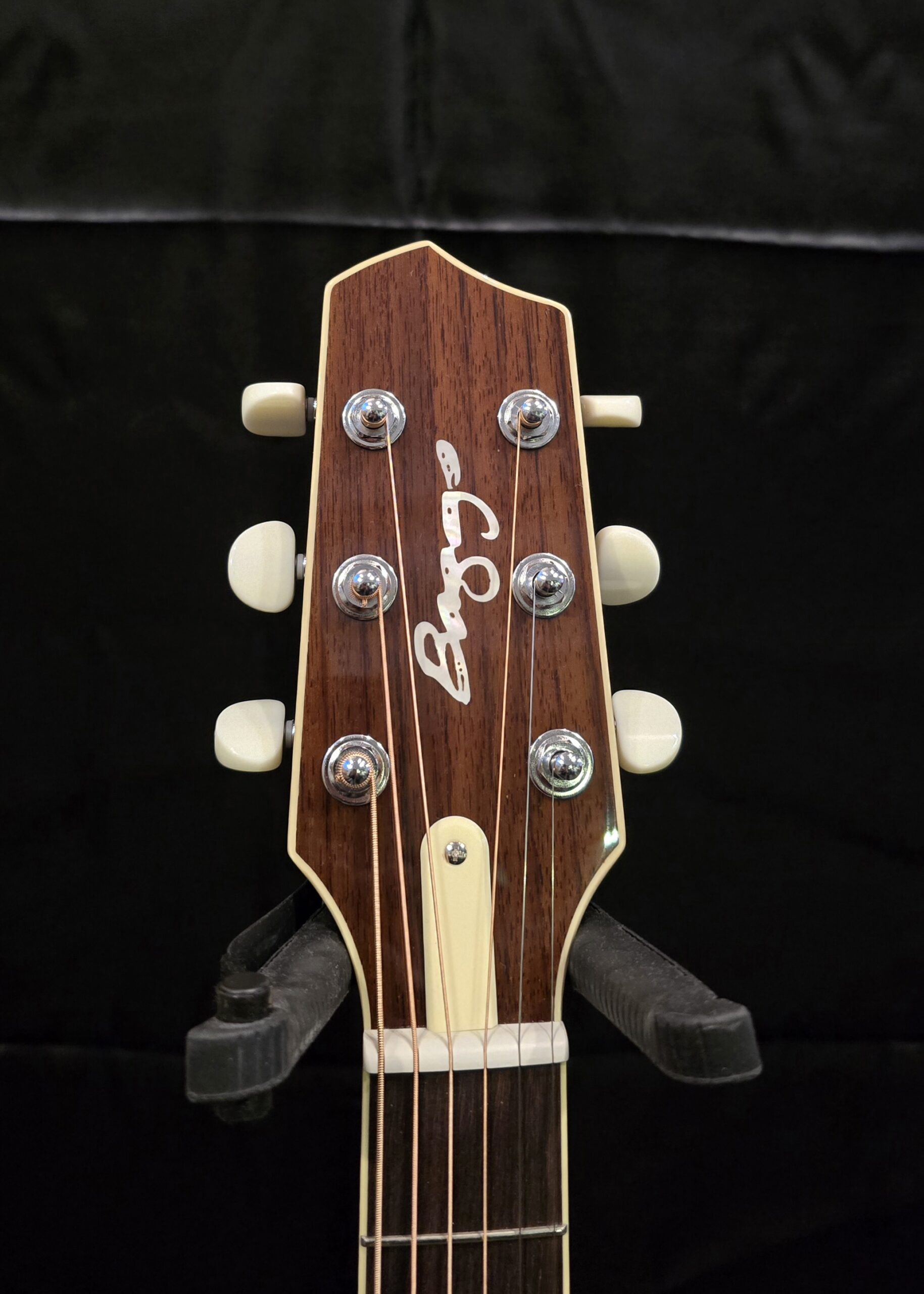 Er zijn drie verschillende bovenbladopties beschikbaar: natuurlijk engelmann sparrenhout, getorrificeerd sitka sparrenhout (zoals hier) en sunburst sitka sparren. Na veel experimenteren bedacht Baggs een stevig multiplex frame waarin het bovenblad en de achterkant van de gitaar zijn ingelegd, met de hals apart vastgeschroefd. Het multiplex frame is zo gemaakt dat de laminaatlijnen zichtbaar zijn rond de randen van de gitaar. Er is ook een aantrekkelijke onderarmafschuining, zoals je die ook aantreft op bepaalde hoogwaardige akoestische gitaren. Het nep-klankgat is een cirkelvormig stukje populierenmultiplex, met de ‘rozet’ als een verzonken uitsparing tussen dit stukje en de bovenkant zelf. Ons exemplaar heeft een achterkant van mooi Indisch palissander en dat alles zorgt voor een mooi, zij het futuristisch, ontwerp.