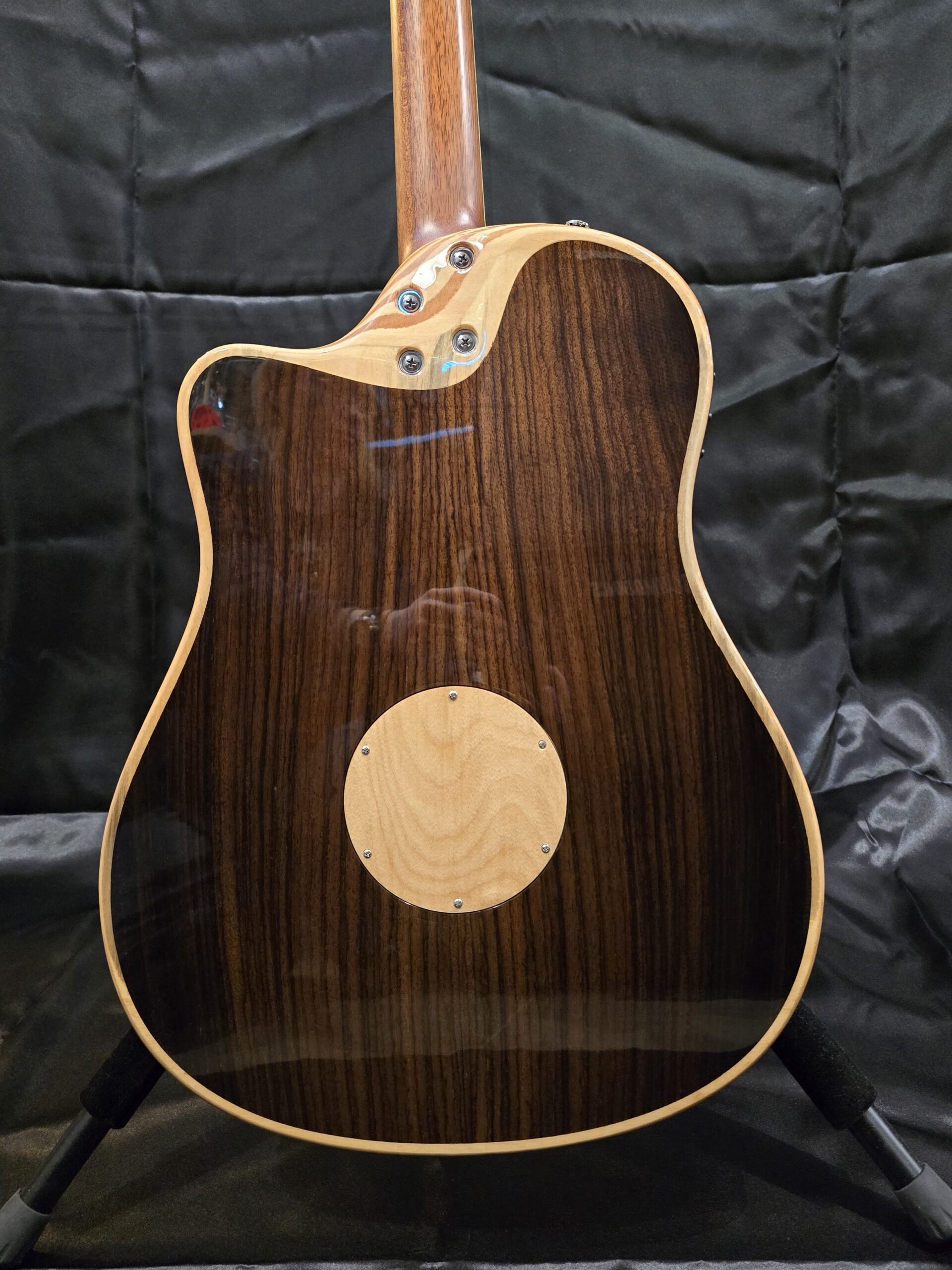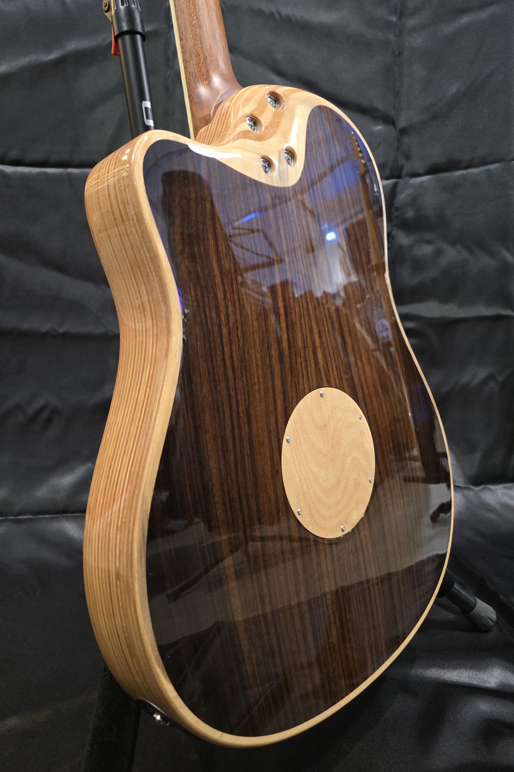 Dit unieke systeem ontlast het boven en achterblad van structurele druk, waardoor ze vrij kunnen resoneren en afzonderlijk kunnen worden “ge-voiced”. Het resultaat: een gevoeligere respons, meer dynamiek, diepere lows en een warme, organische akoestische klank die ongekend is voor een elektrisch-akoestische gitaar met slank profiel.