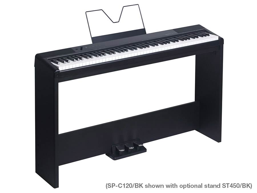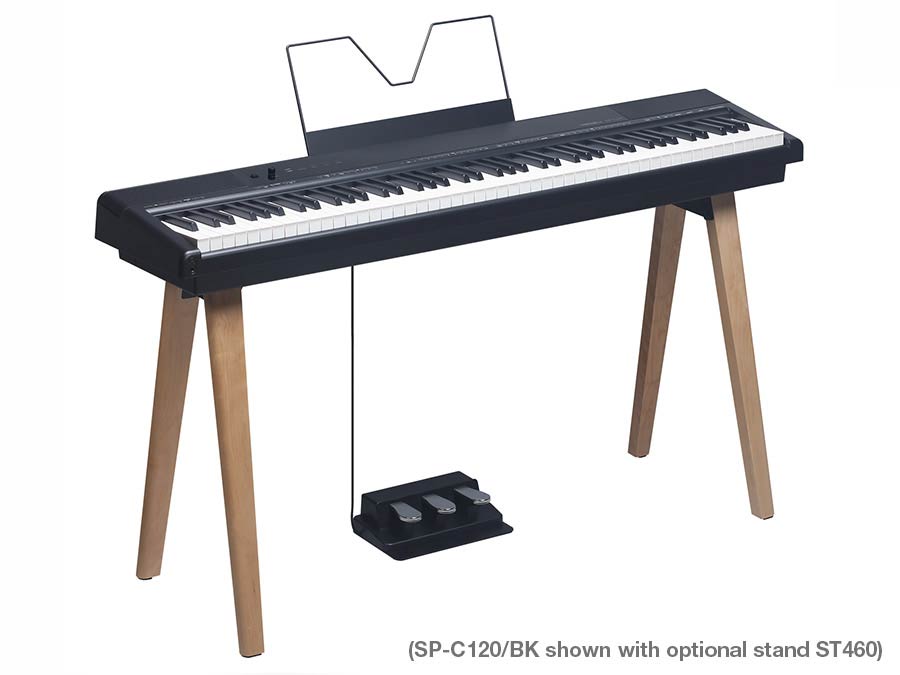De SP-C120 is leverbaar met 2 verschillende meubels, de ST450: Een standaard matzwart piano meubel met een luxe ingebouwd triple pedaal. Of de ST460: Een chique 4 benig design met een natuurlijke houten afwerking, deze word geleverd inclusief een losse luxe triple pedaal box. Ook bieden wij de optie met om een leuke korting een deluxe Boston BFS-40 enkel pedaal mee te leveren.