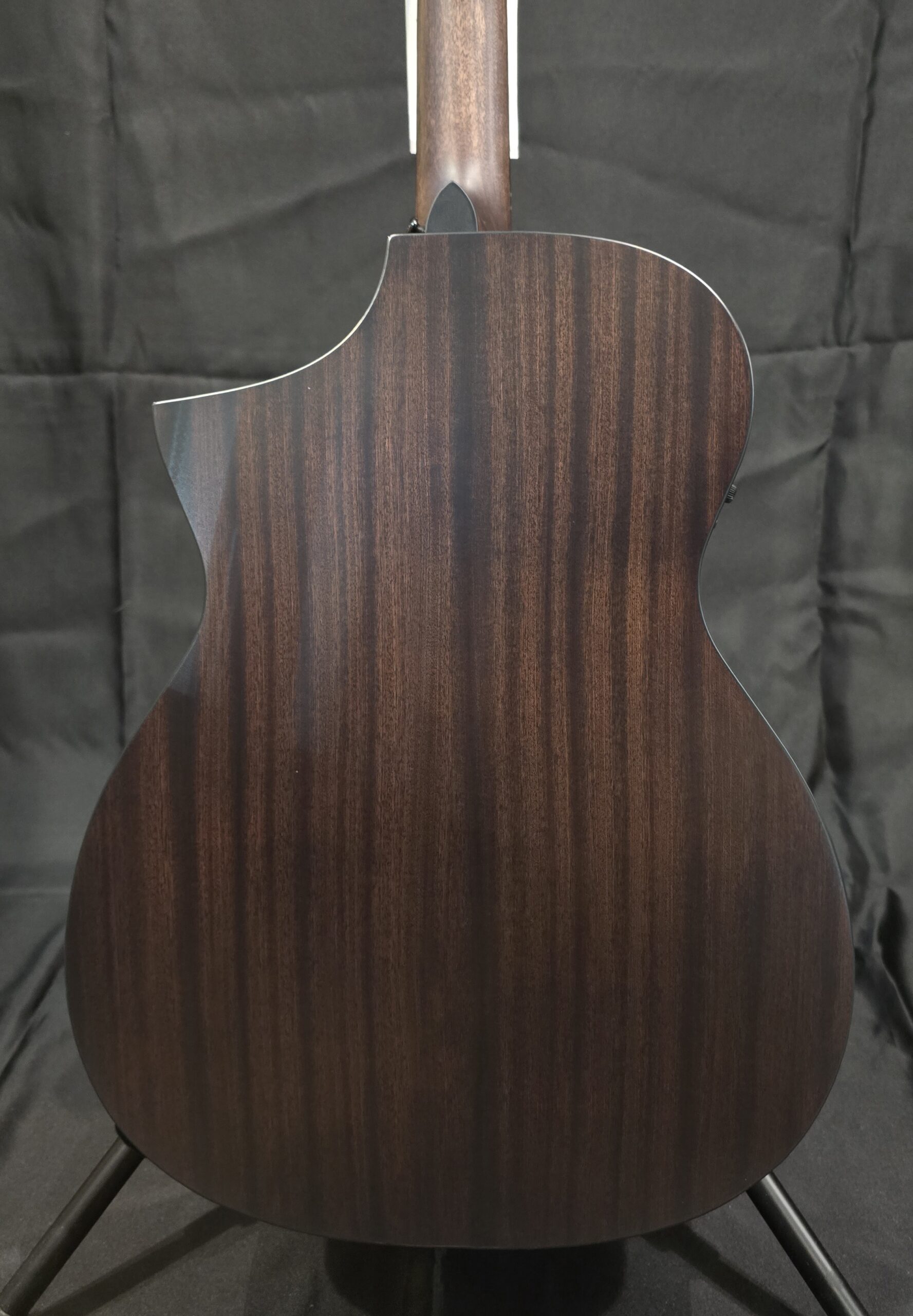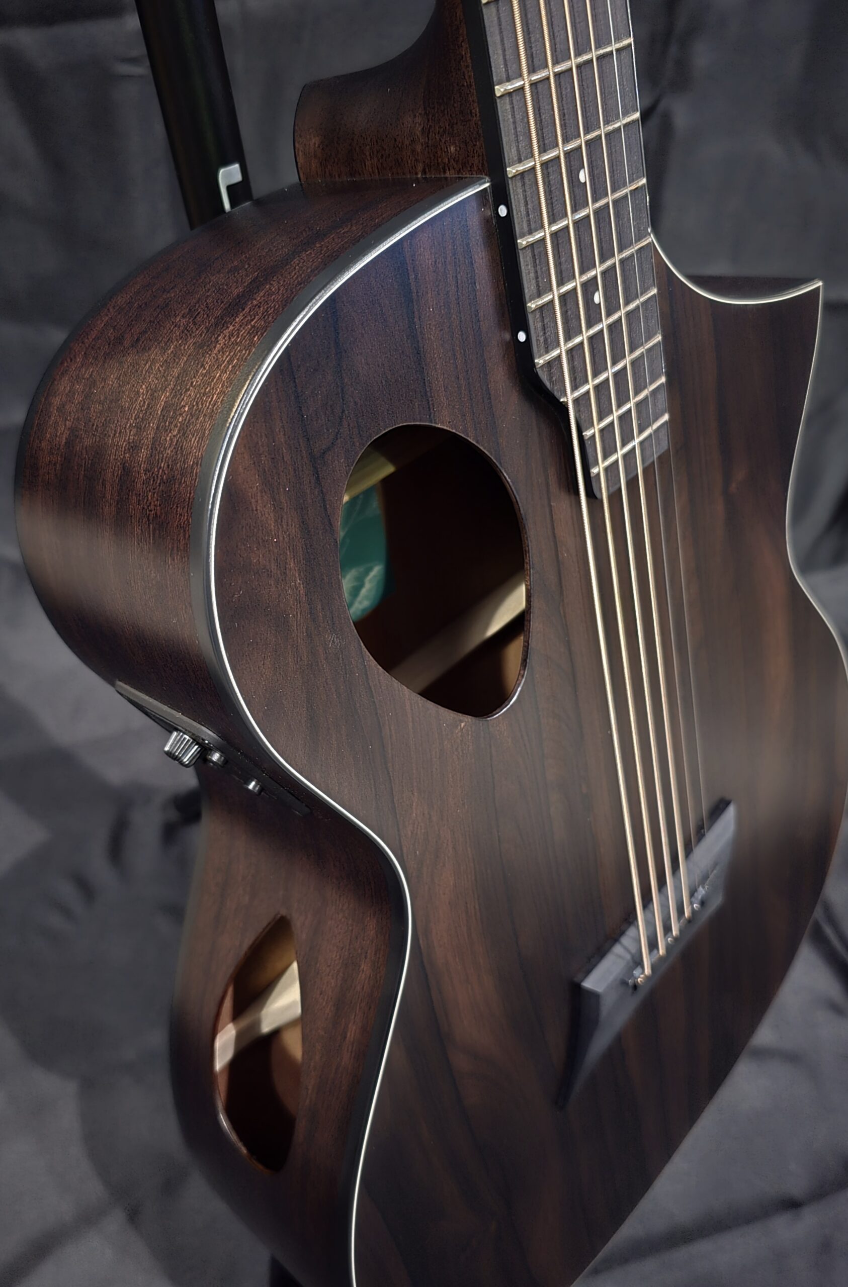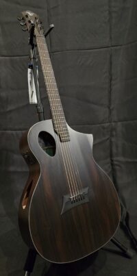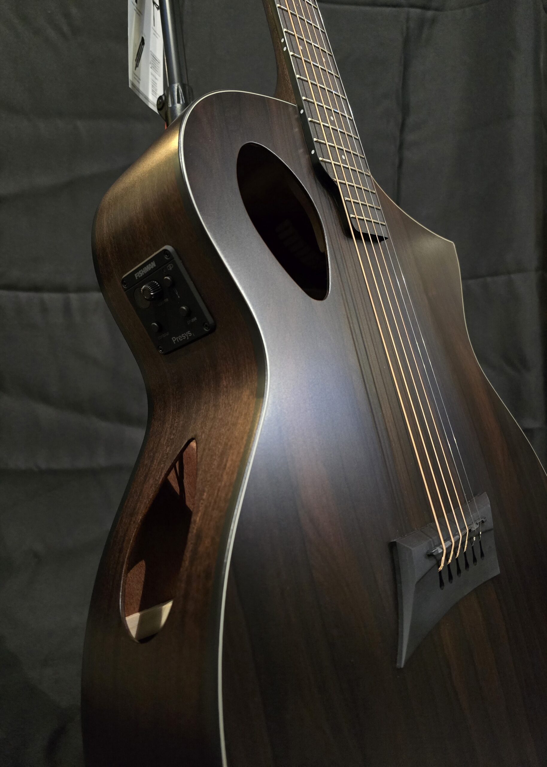 De eerste indruk is direct indrukwekkend dankzij het exotische ziricote-bovenblad, dat niet alleen visueel opvalt maar ook bijdraagt aan het sonore karakter van de gitaar. De okoume zij- en achterkant zorgen samen met het zebra-top voor een volle, warme en diepe klank met uitstekende balans. Zwarte binding en hardware geven het geheel een moderne, luxe uitstraling.