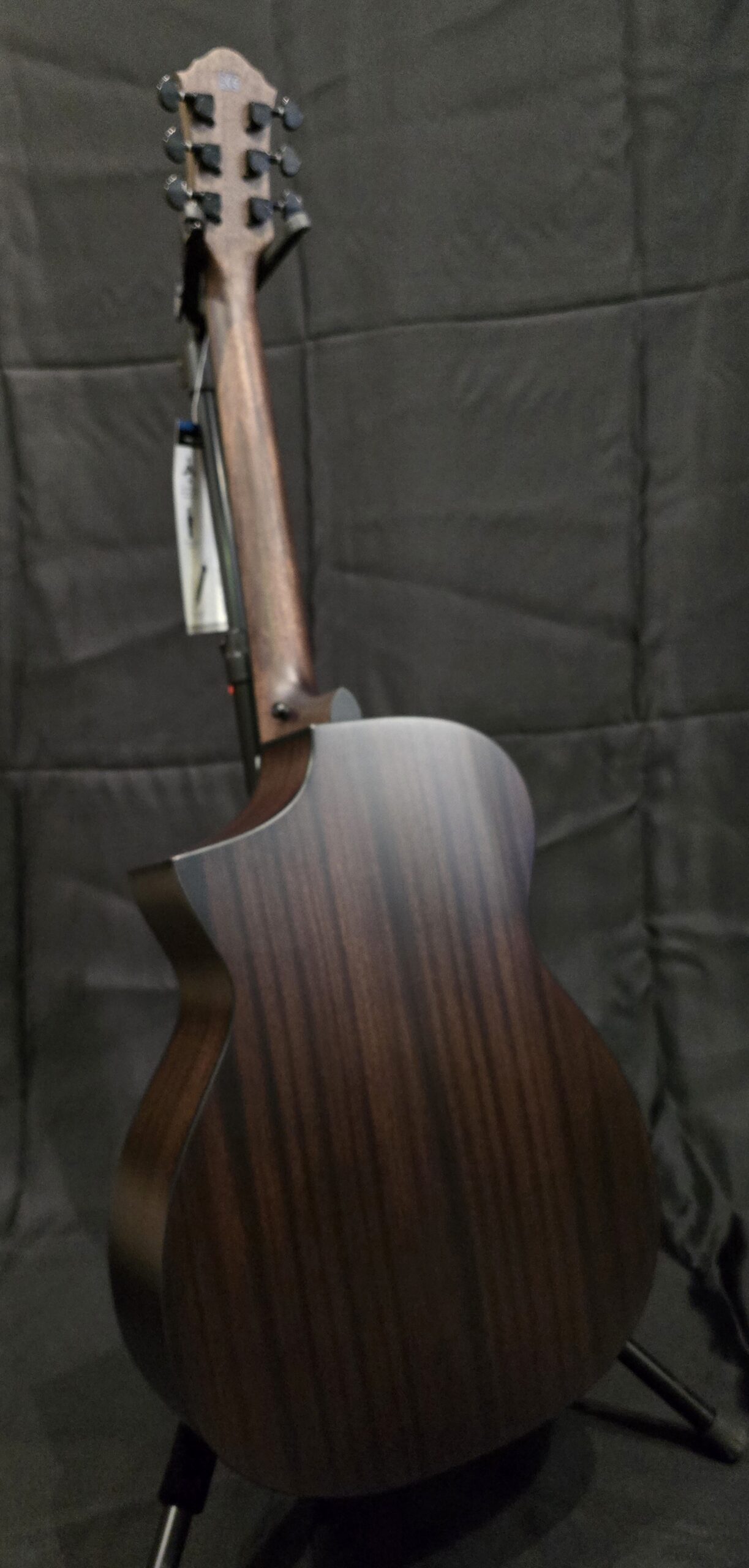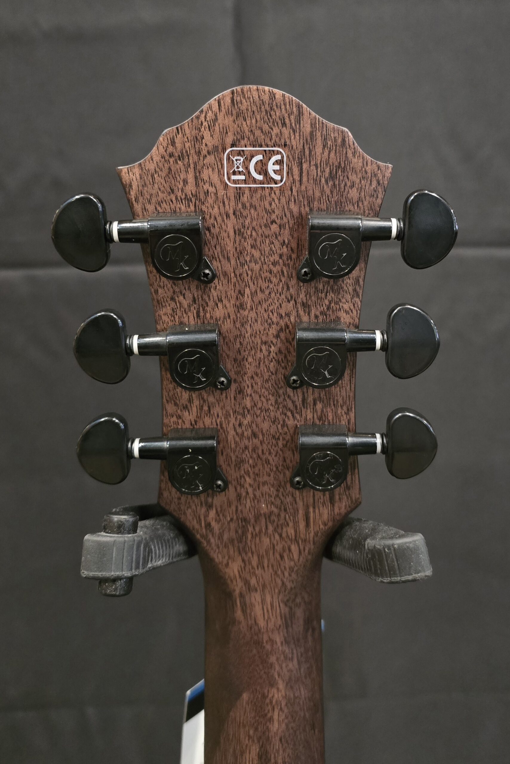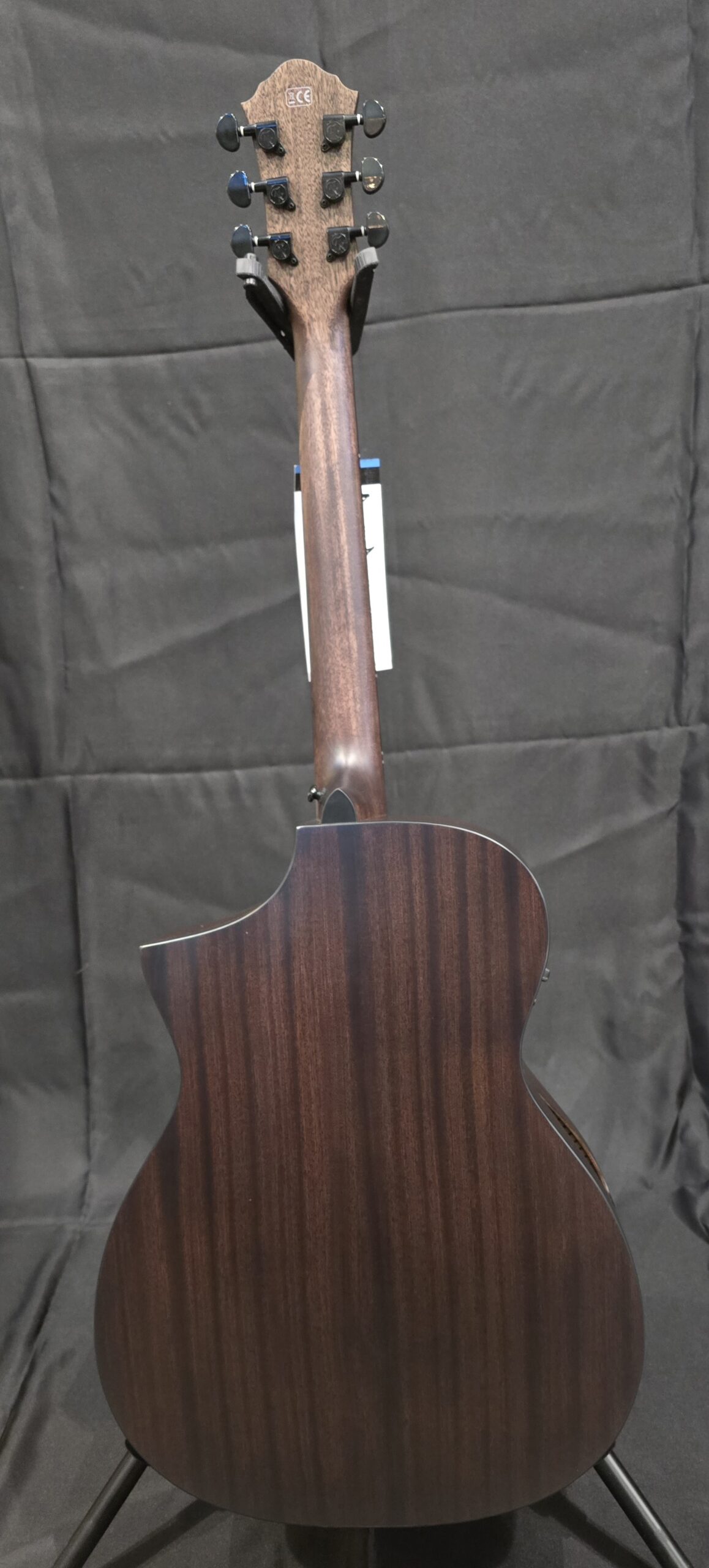 De eerste indruk is direct indrukwekkend dankzij het exotische ziricote-bovenblad, dat niet alleen visueel opvalt maar ook bijdraagt aan het sonore karakter van de gitaar. De okoume zij- en achterkant zorgen samen met het zebra-top voor een volle, warme en diepe klank met uitstekende balans. Zwarte binding en hardware geven het geheel een moderne, luxe uitstraling.