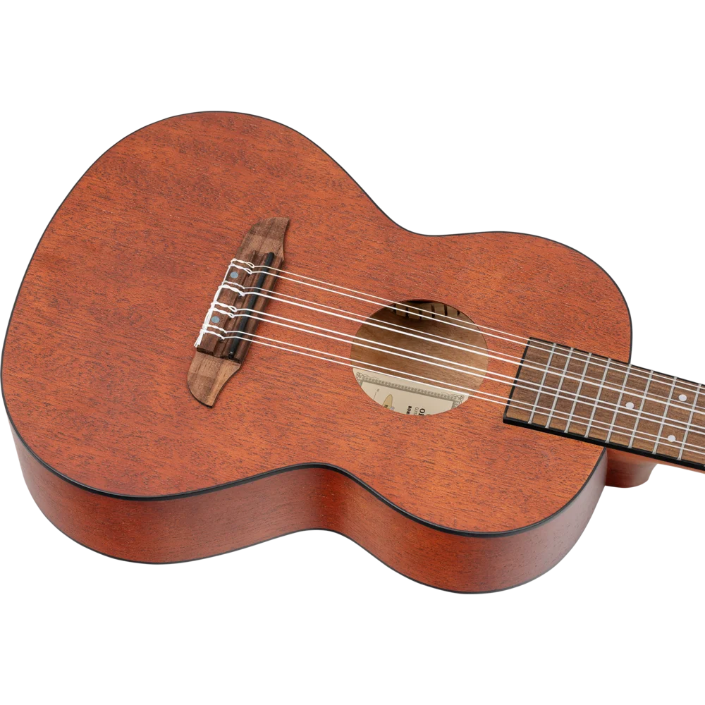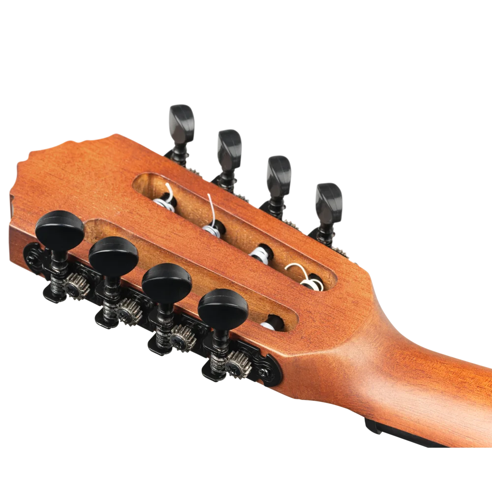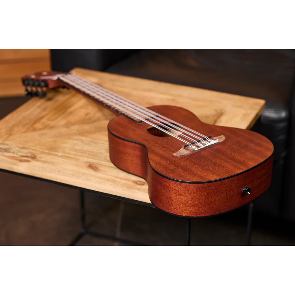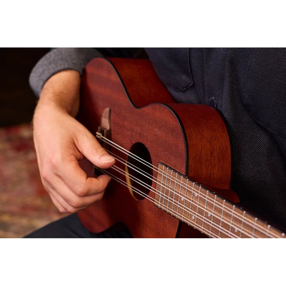 De mahonie top, zij- en achterkant zorgen voor een warme, gebalanceerde klank met een duidelijke middenfocus. In combinatie met de tenor body en de mensuur van 430 mm levert dit een krachtige projectie en meer snaarspanning, wat ervaren spelers extra controle en dynamiek geeft. De 8-snarige configuratie vraagt echter om meer kracht en nauwkeurigheid in de vingers, waardoor deze ukulele minder geschikt is voor absolute beginners.