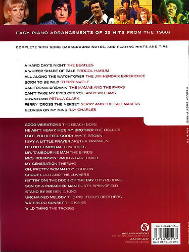 Twenty-five of the biggest hits from the 60s arranged for really easy piano, with lyrics and chord symbols. Not only does this compilation include such classic songs as A Whiter Shade Of Pale and Son Of A PreacherMan, but it also comes complete with background notes and a host of playing hints and tips.