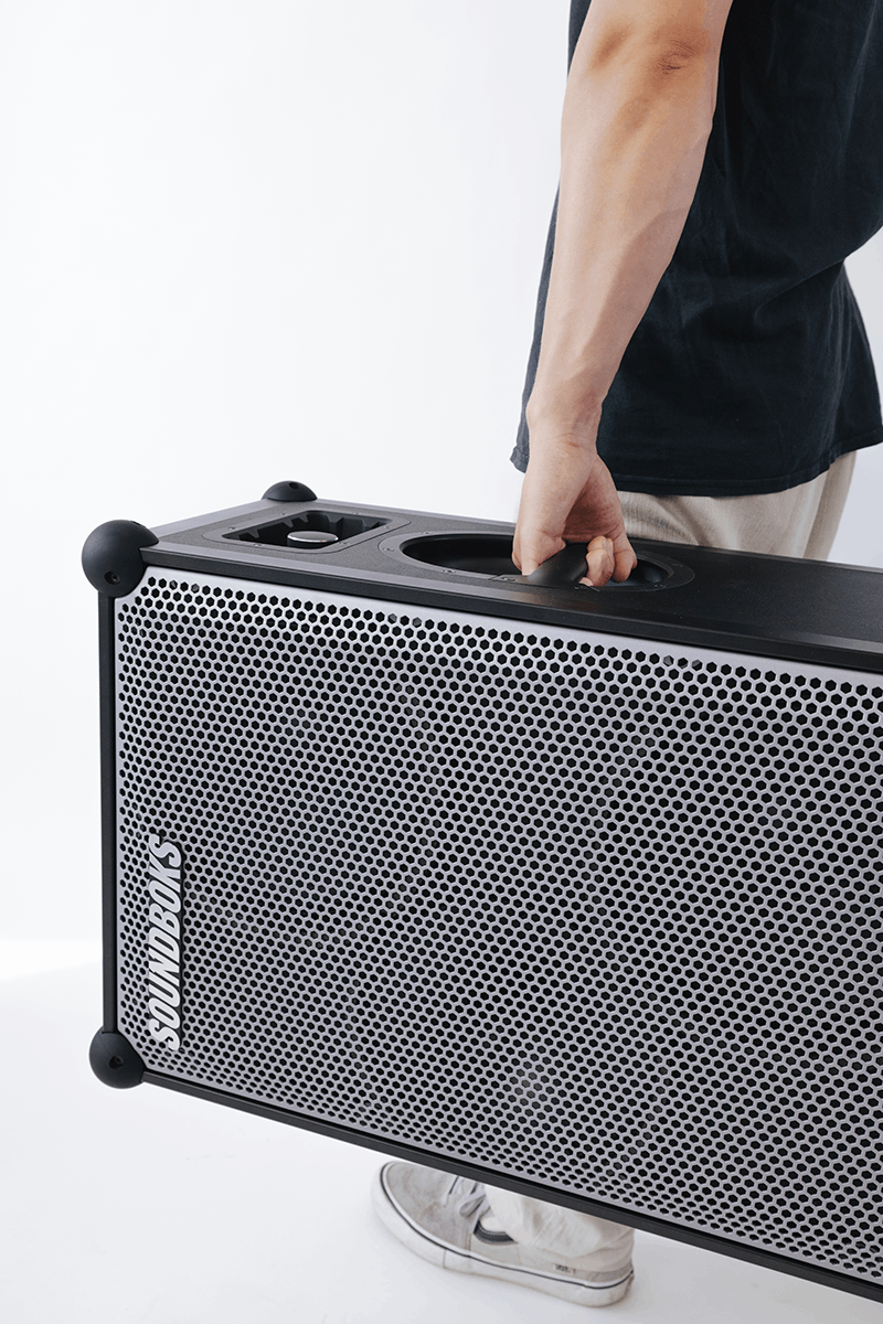 De uitneembare batterij geeft je 40 uur speeltijd bij gemiddeld volume en 6 uur op vol vermogen. Binnen 2 uur laad je hem volledig op met de Soundboks Charger. Wil je langer doorgaan? Wissel simpelweg naar een volle reservebatterij.