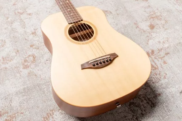 Deze akoestische gitaar met klein lichaam is ongelooflijk goed gebouwd. Dat moet ook wel, want er is sterke concurrentie. De Vintage VTG100N Travel Guitar neemt het rechtstreeks op tegen merken als Martin en Taylor. Dankzij een lagere prijs zonder in te boeten aan kwaliteit, is het echt een kanshebber. Akoestische gitaren met een kleiner lichaam en korte schaal zijn momenteel populair. Ze bieden meer comfort en draagbaarheid. De VTG100N compenseert het kleinere formaat qua klank door het massief sparrenhouten bovenblad. Dit maakt een groot verschil voor de toon van het instrument. Het klinkt rijk en levendig. De totale afwerking van het instrument is natuurlijk mat gelakt, wat het plakkerige gevoel van een gloss afwerking vermijd. Het laat het hout ook echt resoneren.